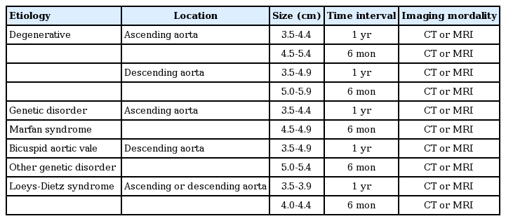 비유전적인 원인으로 발병한 상행대동맥류의 크기가 5.5 cm 미만인 경우는 크게 두 부류로 나누어 정기검사를 시행하도록 권고된다. 3.5-4.4 cm는 1년에 한 번 CT 또는 MRI를 시행하고, 4.5-5.4 cm는 6개월에 한 번 CT 또는 MRI를 시행하여 5.5 cm 이상이 되면 수술이나 중재적 치료를 한다. 말판 증후군과 같은 유전적인 원인에 의한 상행대동맥류는 3.5-4.4 cm는 1년에 한 번 CT 또는 MRI를 시행하고, 4.5-4.9 cm는 6개월에 한 번 CT 또는 MRI를 시행하여 5.0 cm 이상이 되면 수술이나 중재적 치료를 한다[5,10]. 하행대동맥류에 대해서는 상행대동맥류 기준에 0.5 cm를 더하여 검사 및 치료를 진행한다. 대동맥류의 진행속도가 빠른 Loeys-Dietz 증후군에 의한 확장증은 4.5 cm 이상에서 중재적 치료를 시행하므로 4.0 cm 미만은 1년에 한 번, 4.0 cm 이상은 6개월에 한 번 영상 검사를 시행하도록 한다(Table 1). 심장초음파 검사는 비침습적이고 안전한 검사지만 aortic root에 국한해서만 볼 수 있기 때문에 일반적인 흉부대동맥 확장증 환자에게 정기적인 검사 방법으로 권고되지는 않는다. 하지만 말판 증후군을 비롯한 유전적 원인의 흉부대동맥류는 진단 당시와 6개월 이후에 각각 심장초음파 검사를 시행하여 상행대동맥의 크기가 증가하는지 관찰하도록 권고되고 있다[5]. 또한 이첨판 판막을 동반한 확장증 환자에서도 CT 또는 MRI 검사와 같이 시행한다면 도움이 될 수 있는 검사 방법이다.