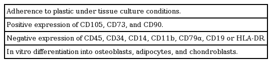 중간엽 줄기 세포는 최소한 다음의 세 가지 조건을 충족하여야 한다(Table 1). 첫째, 배양 용기에 부착되어 증식되어야 한다. 둘째, 특정 세포표면 항원이 발현되거나 발현되지 않아야 한다. 즉, 특정 세포표면 항원으로 CD105, CD73, CD90이 존재하여야 하며, 조혈모세포 항원인 CD45, CD34, CD14, CD11b, CD79α, CD19 또는 HLA-DR 항원 등은 없어야 한다. 셋째, 시험관 내에서 골모세포, 지방세포, 연골모세포로 분화 할 수 있어야 한다 [5]. 중간엽 줄기 세포에는 골수 줄기 세포, 제대혈 줄기 세포, 지방 줄기 세포, 신경 줄기 세포 등이 있다[6].