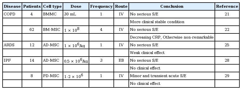 중간엽 줄기 세포를 이용하여 각종 난치성 호흡기 질환을 치료하려는 임상 시험 연구는 여전히 부족한 실정이며, 그 치료 효과 또한 만족스럽지 못한 것이 사실이다. 지금까지 수행되어 발표된 각종 임상 시험 연구들을 표 2에 정리하였다.
