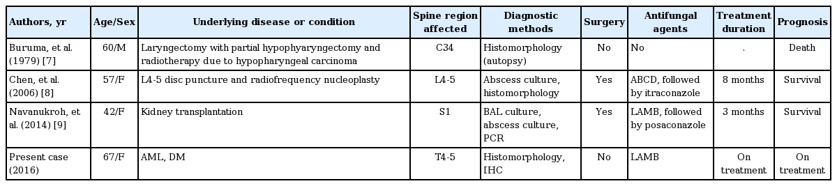 털곰팡이증에 의한 척추 골수염은 매우 드문 질병으로 1970년부터 2016년 1월까지 전 세계적으로 3예가 보고되었다(Table 1). Buruma 등[7]은 암으로 인하여 후두절제술 및 부분 하인두절제술(laryngectomy with partial hypophyaryngectomy) 및 방사선 치료를 받았던 적 있는 환자에서 목 통증이 있으며 천천히 진행하는 근력 저하(양쪽 팔부터 시작하여 사지마비로 진행) 환자를 보고하였다. 이 환자는 추후 광범위 폐색전증으로 인하여 사망하였는데, 부검을 통하여 조직학적으로 넓고 non-septate된 균사가 보여 털곰팡이증으로 진단하였고(배양 검사는 시행하지 않았음), 이로 인한 척추 골수염 및 경막외 농양이 신경학적 결손의 원인임을 확인하였다. Chen 등[8]은 요추 천자 및 radiofrequency nucleoplasty를 시행받은 이후 털곰팡이증에 의한 척추 골수염 및 척추 추간판염을 보고하였다. 털곰팡이증은 농양에서 시행한 배양 검사상 Rhizopus rhizopodoformis가 동정되었고, 조직학적으로 털곰팡이증에 합당한 균사가 확인되어 진단되었다. 이 환자는 liposomal amphotericin B 투약과 함께 두 차례의 수술적 변연절제술을 시행하여 완전히 치료되었다. 마지막으로 2014년에 Navanukroh 등[9]은 신장이식을 받은 지 1개월이 지난 환자에서 털곰팡이증에 의한 폐 감염 및 엉치뼈(sacral spine)의 골수염, 허리엉치뼈(lumbosacral spine)의 경막외 농양을 보고하였다. 털곰팡이증은 농양 및 기관지폐포세척액 배양검사에서 Cunninghamella spp.이 동정되었고, 중합효소연쇄반응검사를 통해 Cunninghamella bertholletiae로 확인되어 진단되었으며, 수술적 변연절제술 및 liposomal amphotericin B 투약으로 호전되었다.