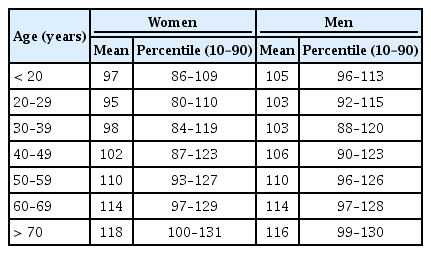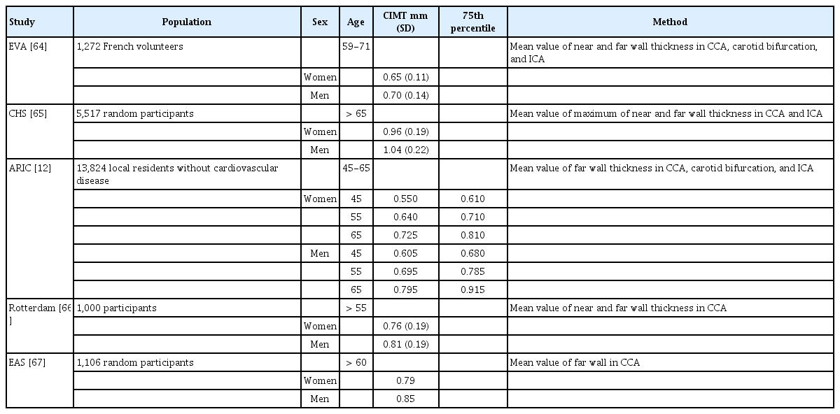 1998년 Rotterdam 연구[11]에서는 55세 이상 1,373명의 정상 대조군에서 평균 IMT는 0.795±0.153 mm였고, Chambless 등[12]은 45-64세 15,792명을 대상으로 한 연구에서 정상치를 남, 여 각각 0.76 mm, 0.68 mm로 보고하였으며, 다양한 인종에서 나이와 성별에 따른 여러 연구들에서 경동맥 내중막 두께 측정치가 보고되었다(Table 1). Lee 등[13]이 국내 연구로 성인 자원자에서 측정한 평균 CIMT 수치는 남, 여 각각 0.67 mm, 0.68 mm였으며, 상한 정상치를 0.83 mm로 보았으며, Bae 등[14]이 35세 이상 국내 성인을 대상으로 한 조사에서 총경동맥에서 측정한 CIMT 수치는 정상 대조군에서 우측과 좌측이 각각 0.63 mm, 0.64 mm로 남자에서 여자보다 두꺼우며, 나이가 들수록 증가하는 것으로 나타났다. CIMT는 여러 인자에 의해 영향을 받으며 대상군에 따라 조금씩 차이가 있으나, 심혈관계 위험인자들과의 긴밀한 연관성에 대해서는 잘 알려져 있다.
