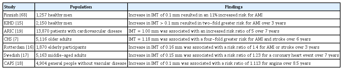 동맥벽의 두께 증가는 죽상경화의 특징으로 CIMT의 측정이 심혈관계 질환 예측의 역할을 하며 따라서 전통적인 위험인자의 심혈관계 질환의 예측에 부가적인 역할을 할 수 있다. 몇몇 연구들에서 CIMT와 향후 심혈관계의 발생 사이에 관련이 있음을 보였다. Kuoppio Ischaemic Heart Disease Study에서는 CIMT 0.1 mm 증가 시 심근경색의 위험이 11% 증가함을 보였다[15]. 이후, the Cardiovascular Health Study [7], the Rotterdam Study [16], the Malmo Diet and Cancer Study [17], the Carotid Atherosclerosis Progression Study [18]와 같은 여러 대규모 연구에서도 유사한 결과를 보였고, the Atherosclerosis Risk In Communities study [19]에서는 CIMT 수치가 1.0 mm 이상이면 심근경색증이나 뇌혈관 질환의 위험이 현저하게 증가된다고 보고되었다(Table 2). 그러나 다른 연구들에서 Framingham Risk Score와 같은 전통적인 위험인자 점수에 CIMT를 추가하는 것이 심혈관계 질환의 예측에 있어 추가적인 가치를 보여주지 못함으로 인하여 심혈관계 질환의 위험도 예측을 위한 CIMT의 측정에는 이견이 있다[20].