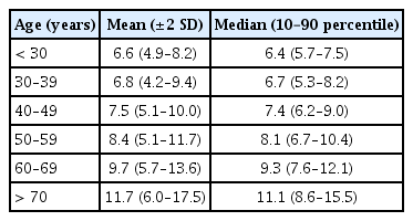 2007년 유럽고혈압심장학회 가이드라인에서는 cfPWV가 12 m/s 이상인 경우를 표적장기 미세 손상의 한 인자로 제시하였고, 또한 혈관경직도가 증가한 경우를 고위험군으로 분류하는데, PWV는 나이와 혈압 등과 같은 많은 임상요인에 영향을 받을 수 있어, PWV의 평균값, 절단값(cutoff values)은 연구의 포함된 대상에 따라 다양하다[30]. 2010년 유럽의 8개 국가 16,867명을 대상으로 cfPWV의 정상값을 확인하기 위한 연구가 진행되었다(Table 3) [31].