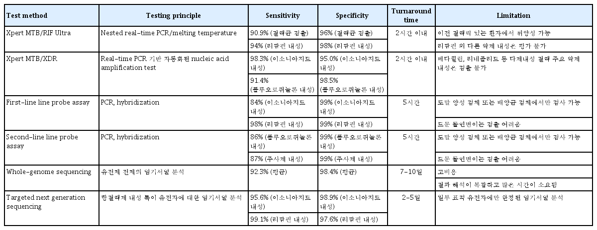 결핵 진단에서 분자 진단 검사법은 기존의 검사에 비해 더 신속하고 정밀한 정보를 제공하며 특히 약제 내성 여부를 조기에 파악하는 데 뚜렷한 장점을 가진다. Xpert MTB/RIF Ultra와 line probe assay는 현재 임상 현장에서 널리 사용되는 약제 내성 신속 진단 검사법이고 whole genome sequencing과 targeted next-generation sequencing은 진단과 내성 판별에서 새로운 검사법으로 주목받고 있다. 표 1은 각 검사법의 검사 원리, 진단율과 한계점을 정리한 것으로 이러한 특성을 정확히 이해하고 임상 상황에 적절히 해석 및 적용할 수 있을 때 진단 정확도는 물론 치료 성과 또한 향상될 수 있을 것이다.