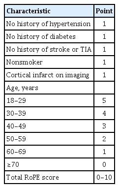 동맥 경화로 인한 뇌경색 환자는 고혈압, 당뇨병, 고지혈증, 흡연력과 같은 주요 위험 요인을 동반하는 경우가 많은 반면 난원공 개존증과 연관된 뇌경색 환자는 이러한 위험 요인이 적은 젊은 연령에서 발생하는 경우가 흔하다. 이러한 특징을 기반으로 개발된 역설적 색전증 위험 점수(risk of paradoxical embolism, RoPE)는 난원공 개존증과의 연관성을 평가하며 6점 이상인 경우 난원공 개존증으로 인한 뇌경색 가능성이 높다(Table 1) [12].