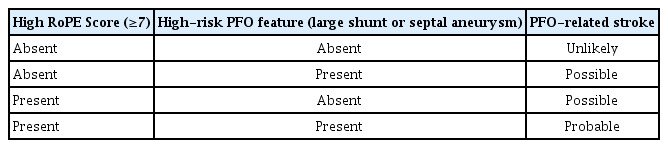 난원공 폐쇄술 효과에 대한 특징을 고려하여 Kent 등[24]은 기존의 난원공 폐쇄술 관련 무작위 연구를 추가 분석하여 난원공-연관 뇌경색 인과 가능성 분류 체계(patent foramen ovale-associated stroke causal likelihood, PASCAL)를 제안하였다. PASCAL 점수는 기존의 RoPE 점수에 더해 큰 단락(large shunt) 또는 심방중격류(atrial septal aneurysm)와 같은 고위험 난원공 특징의 유무를 결합하여 난원공과 뇌경색 간의 인과 가능성을 평가한다. PASCAL 점수 체계에서 큰 단락은 경식도 초음파에서 좌심방에 20개 이상의 미세 기포가 관찰되는 경우로 정의되며 심방중격류는 중심선에서 10 mm 이상 편위되는 경우로 정의된다. PASCAL 알고리즘에 따라 난원공이 뇌경색의 가능한 원인으로 분류된 환자에서 중앙값 57개월 동안의 추적 관찰 결과 재발성 뇌경색 위험이 유의미하게(90%) 감소하였다. 반면 난원공과 무관한 뇌경색으로 분류된 환자에서는 난원공 폐쇄술이 재발성 뇌경색 위험 감소와 관련이 없었으며 오히려 기기 관련 심방세동 발생률이 더 높았다[24]. PASCAL 분류 체계에 따라 가 능성 낮음(unlikely), 가능성 있음(possible), 가능성 높음(probable)으로 분류된 환자의 위험비(hazard ratio)는 각각 1.14 (95% confidence interval [CI], 0.53-2.46), 0.38 (95% CI, 0.22-0.65), 0.10 (95% CI, 0.03-0.35)으로 나타나 PASCAL 분류 체계를 바탕으로 환자를 선별할 수 있는 가능성을 보여주었다(Table 3).