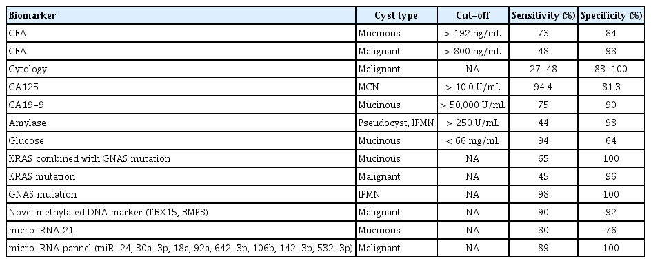 EUS-세침 흡인술(EUS-fine needle aspiration, EUS-FNA)을 통해 얻어진 낭종액(cyst fluid)은 양성 및 악성 췌장 낭성 병변(pancreatic cystic neoplasms, PCNs)의 감별을 위한 세포학적 분석(cytological analysis) 및 점액성(mucinous) 및 비점액성(non-mucinous) 병변을 구분하기 위한 종양표지자 분석(tumor biomarker analysis)에 사용된다(Table 1). 세포학적 분석은 악성 낭종을 식별하는 데 매우 특이적(83-100%)이지만 민감도(27-48%)는 매우 낮아 진단의 정확도(8-59%)가 비교적 낮다[1]. 이에 비해 낭종액의 종양표지자인 carcinoembryonic antigen (CEA)은 점액성 낭종과 비점액성 낭종을 감별하는 데 있어 기준치(threshold)를 192 ng/mL로 설정하였을 시 민감도 52-78%와 특이도 63-91%로 높은 정확도를 보여주었다[2]. CA19-9, CA724, CA125, CA153와 같은 다른 종양표지자들도 분석하였으나 CEA보다는 낮은 민감도를 보여 임상적 활용에는 제약이 있었다[3]. 낭종액의 아밀라제(amylase) 수치는 낭종이 췌관과 연결되어 있는지를 반영하는 지표로 활용되며 수치가 높은 경우 가성 낭종이나 일부 췌관 내 유두상 점액 종양(intraductal papillary mucinous neoplasm, IPMN)에서 흔히 관찰되는 반면 점액성 낭선종(mucinous cystic neoplasm)과 장액성 낭선종(serous cystadenoma)에서는 일반적으로 250 U/L 미만으로 측정된다[4]. 최근 연구들은 낭액 내 포도당 수치(glucose level)가 점액성 병변을 진단하는 데 있어 CEA 대체 가능성을 보여주었다. 66 mg/dL의 기준치를 사용하였을 때 낮은 포도당 수치는 점액성 낭종 진단에 있어 높은 민감도(94%)와 특이도(64%) 그리고 정확도 (84%)를 보였다[5].
