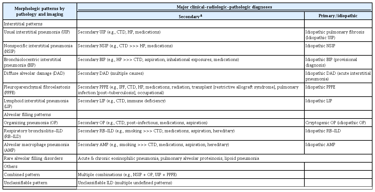 첫 번째 변화이자 가장 큰 변화는 특발성과 이차성 간질성 폐렴의 통합이다. 특발성에 국한되어 있던 기존 분류 체계에서 간질성 폐렴 전체를 분류하는 체계를 이번 개정안에서 제시하였다. 이는 질병의 초기에는 원인이 불분명한 경우가 많고 호흡세기관지염 연관 간질성 폐질환(respiratory bronchiolitis-interstitial lung disease, RB-ILD)과 같은 일부 질환은 특발성이라 간주되기 어려웠으며 특발성이라 불리는 질환조차 기저 원인이 있을 가능성이 있기 때문이다[4]. 이러한 접근은 원인이 불분명한 경우에도 형태학적 패턴에 기반한 잠정적 분류를 가능하게 하여 향후 임상 경과에 따라 진단을 수정하거나 구체화하는 것이 용이하다.