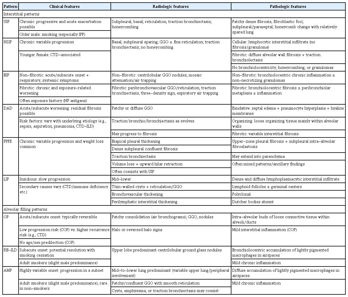 간질성 패턴은 UIP, NSIP, BIP, DAD, PPFE, lymphoid interstitial pneumonia (LIP)로 분류하였다(Table 1). 이 중 가장 흔한 패턴은 UIP, NSIP, BIP이다. 이들 패턴은 대개 진행성 폐섬유증과 불량한 예후와 연관되어 있는 경우가 많다. NSIP와 BIP는 섬유화가 적고 세포성이 더 많은 형태로도 나타나고, 이 경우 예후는 더 양호할 수 있다. 이번 개정에서 중요한 변화인 BIP와 DAD에 대해서 자세히 알아본다.