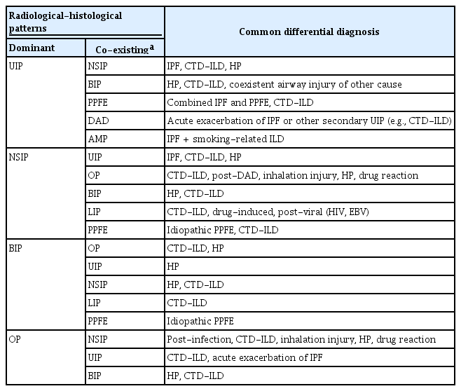 개정된 분류 접근법에서 가장 중요하면서도 기본이 되는 점은 영상/병리 패턴을 기반으로 환자를 분류하고 그 다음 MDD를 통해 환자를 진단한다는 점이다(Fig. 1; Table 1). 즉 패턴과 다학제 진단을 구분하였다. 예를 들어 NSIP는 패턴이고 특발성 NSIP는 다학제 진단이다. 이번 개정에서는 네 가지 주요 변화가 있었다.