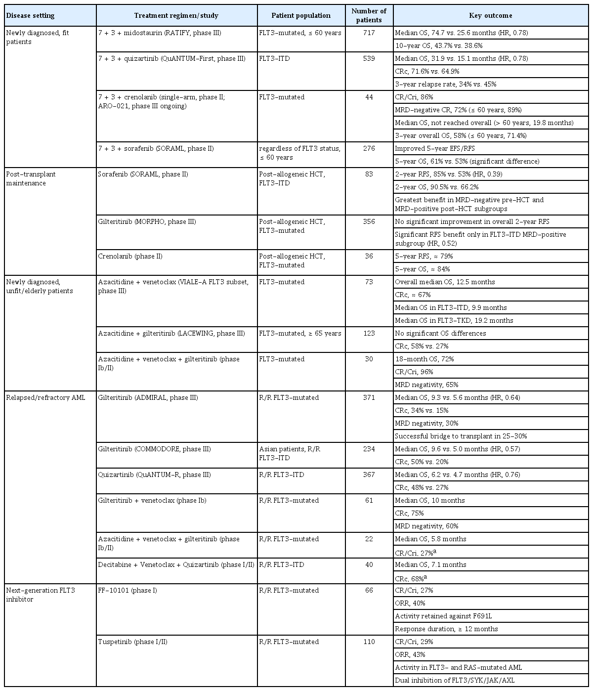 FLT3 변이 AML의 치료는 환자의 고강도 항암 치료 가능 여부에 따라 집중 치료군과 비집중 치료군으로 나뉜다. 각 임상 단계에서 사용되는 FLT3 억제제 병용 요법과 주요 임상시험 결과는 표 1에 요약하였으며 이후 절에서 각 치료군의 세부 데이터를 서술한다.