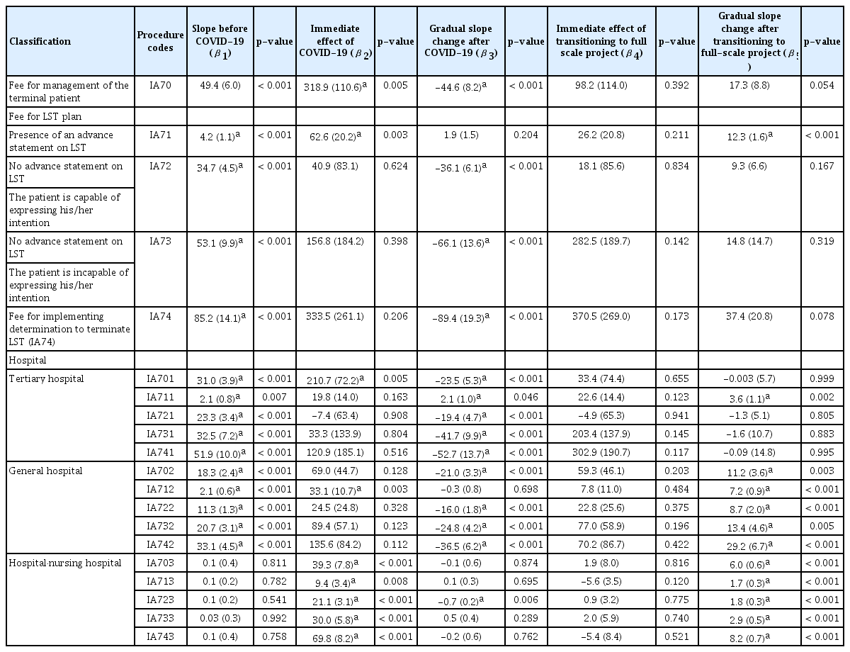 Our interrupted time-series analysis used the onset of COVID-19 (January 2020) as its reference point. The slopes of most codes for LST decisions and their implementation decreased following the onset of COVID-19. When divided by hospital class, all codes in hospitals, nursing hospitals, and oriental medicine hospitals showed immediate increases before and after the COVID-19 outbreak. A separate interrupted time series analysis was conducted using the transition to a full-scale project (January 2022) as the reference point. While no immediate effects were observed before or after transitioning to full-scale projects, in the institution-specific data, the slopes of all codes in general, nursing, and oriental medicine hospitals increased.